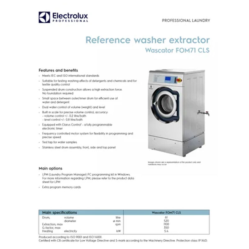 The Wascator FOM 71 CLS Lab Washer-Extractor is a standard reference laboratory washing machine designed for textile testing and quality evaluation. The system is fully microprocessor controlled, allowing users to create and store up to 999 customized washing and drying programs via the integrated keyboard.